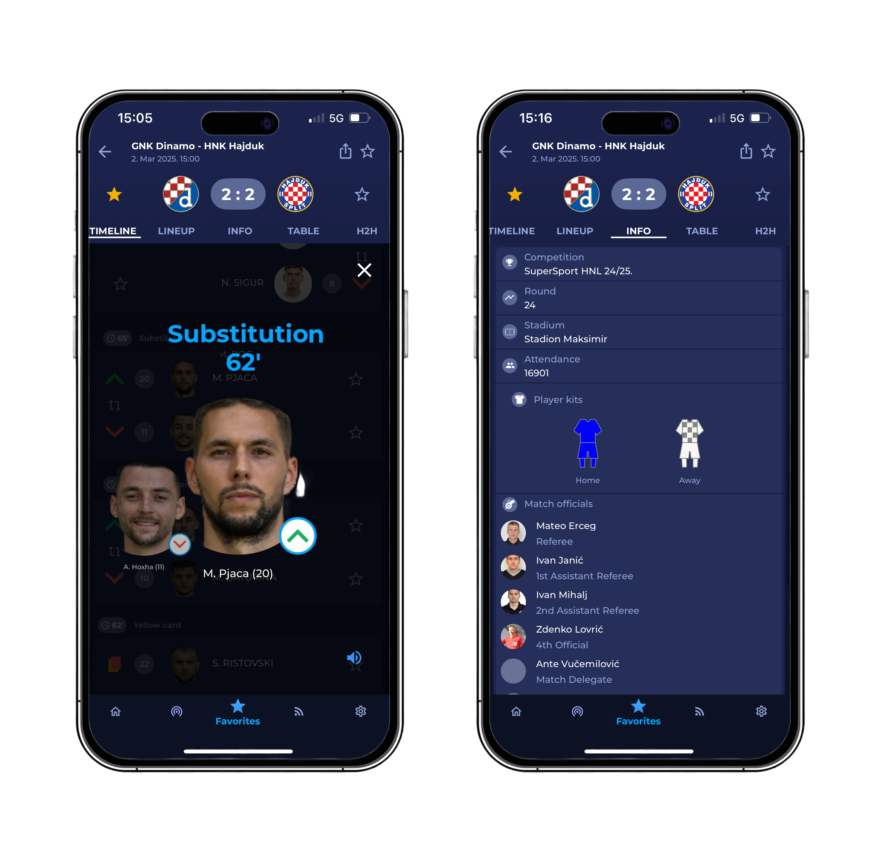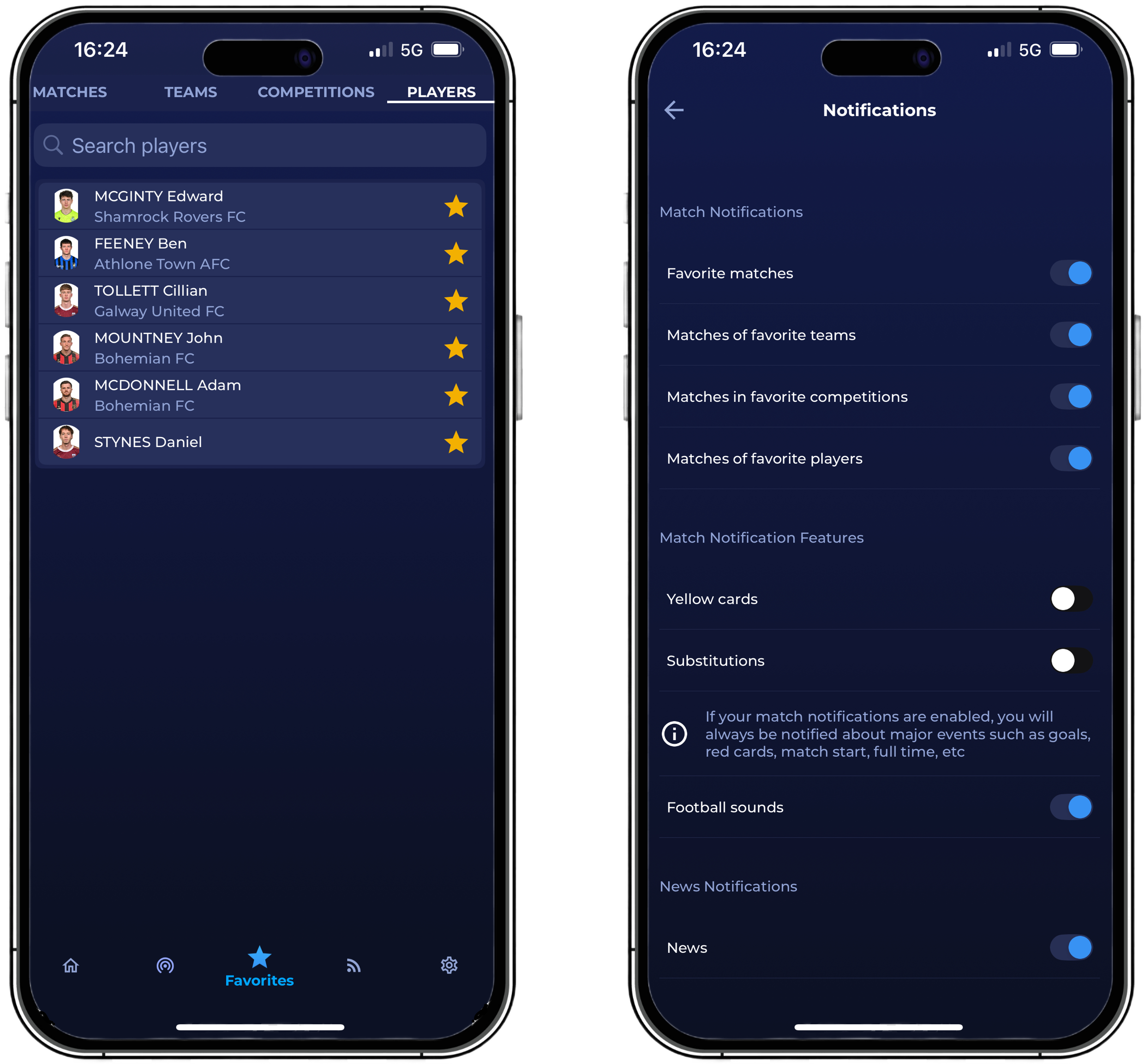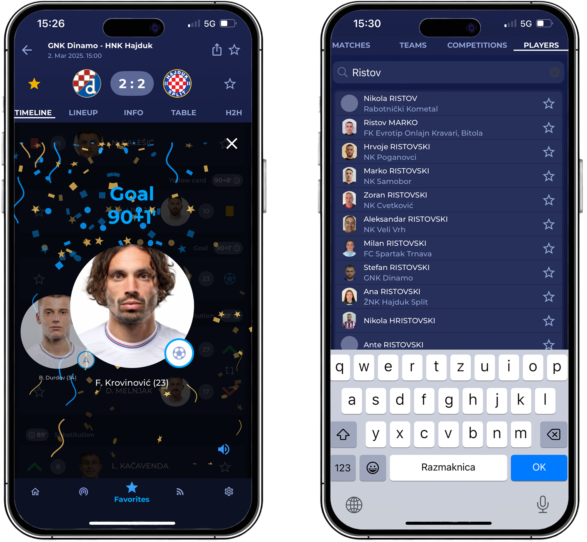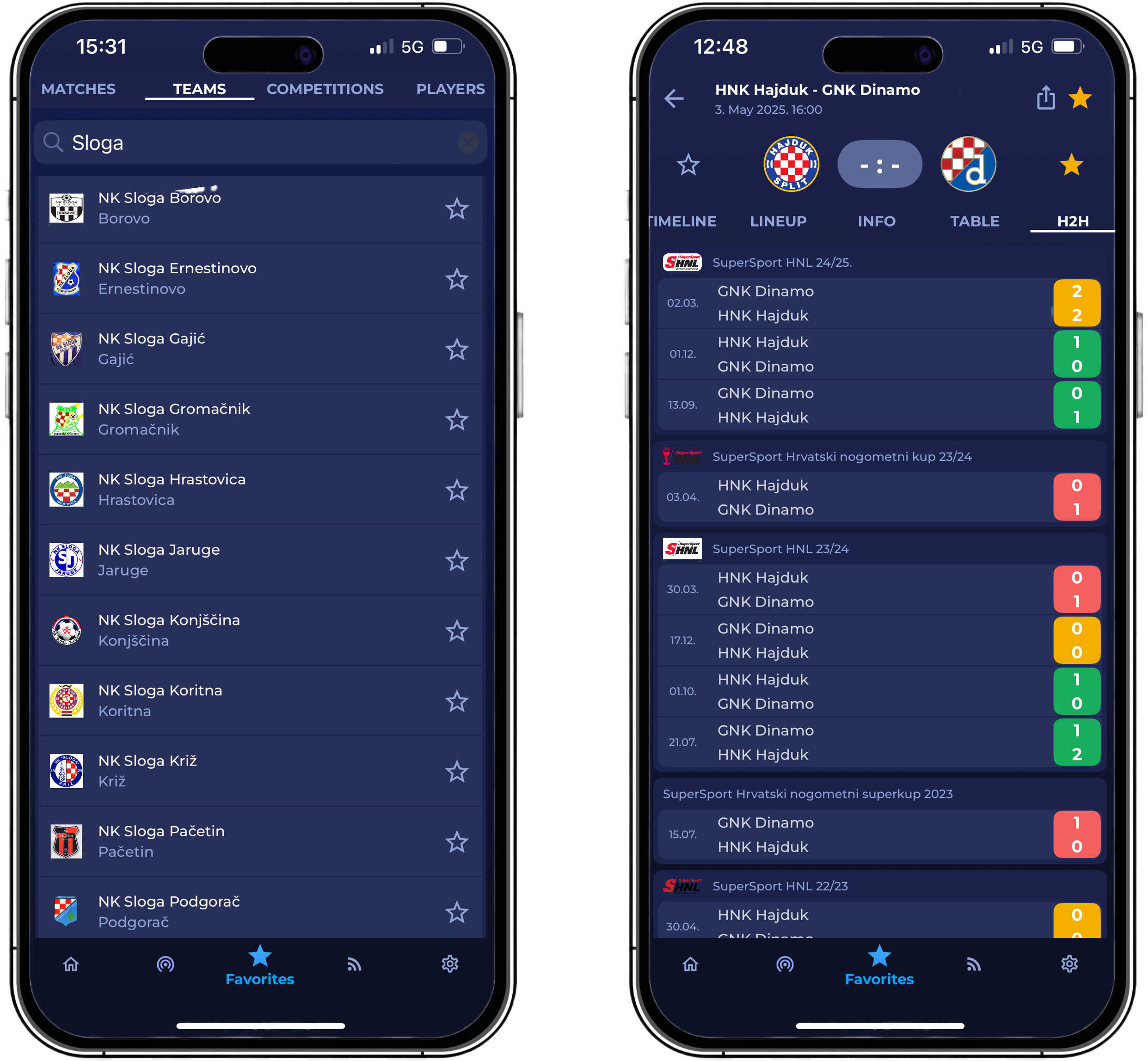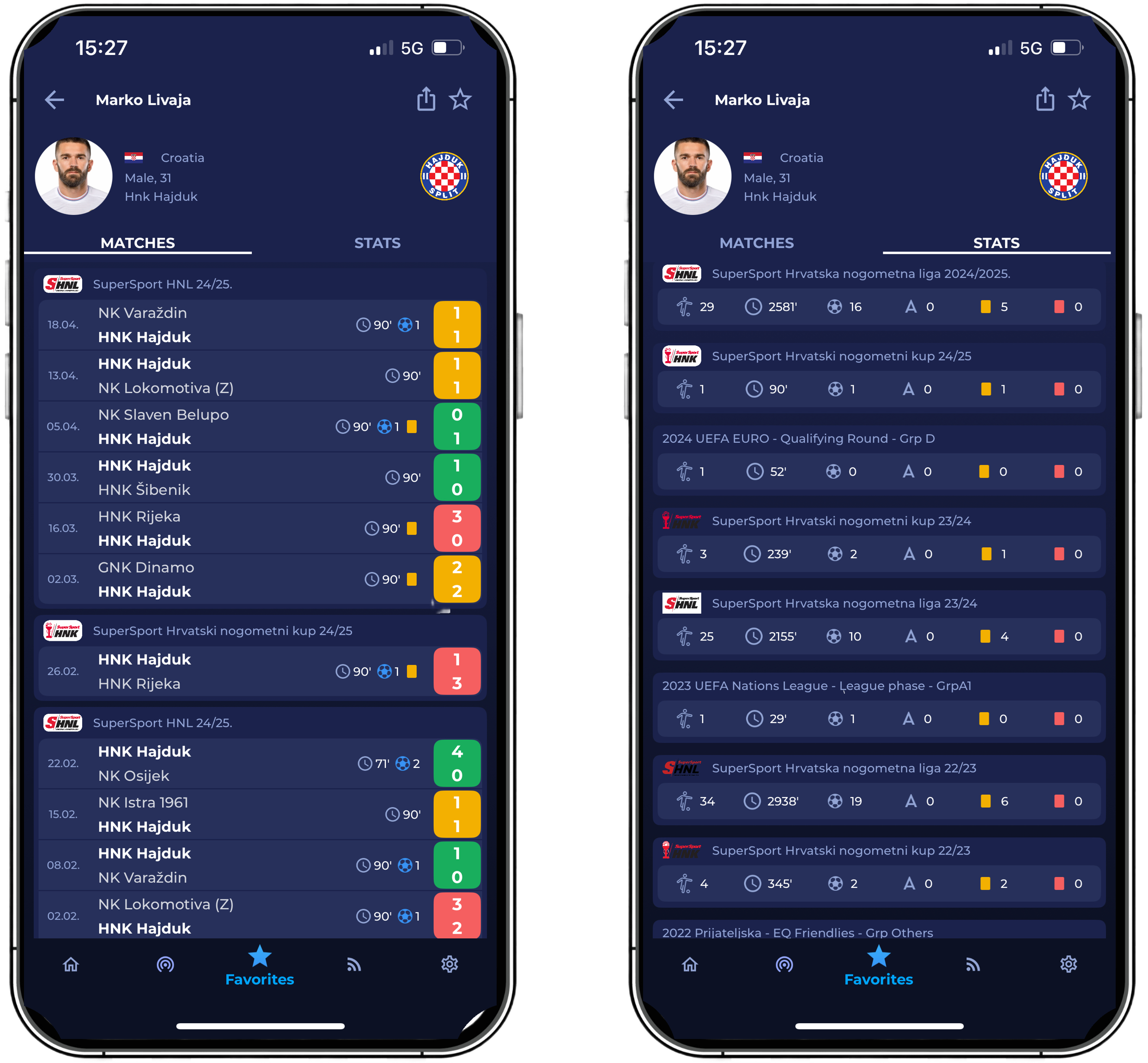- Add any item (Player, Match, Club/Team, Competition) to favorites for quick access from the Favorites menu