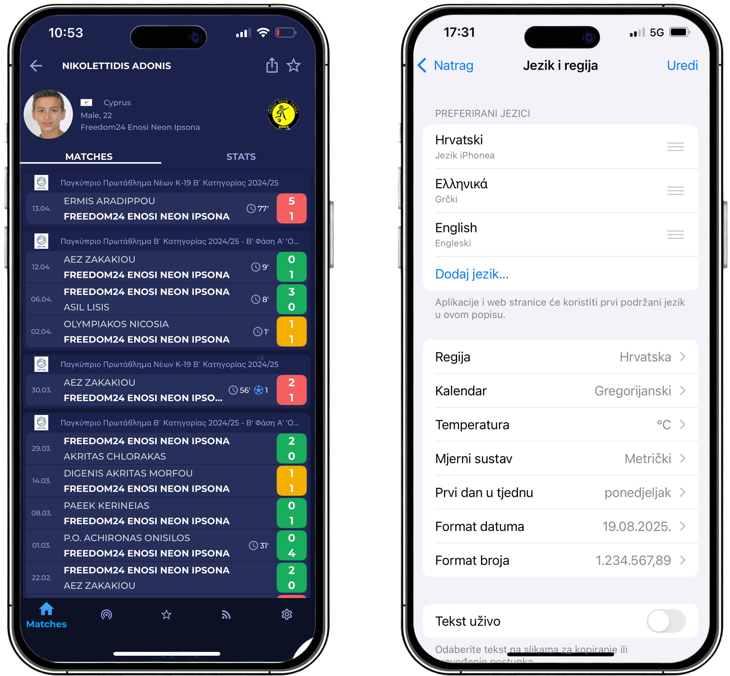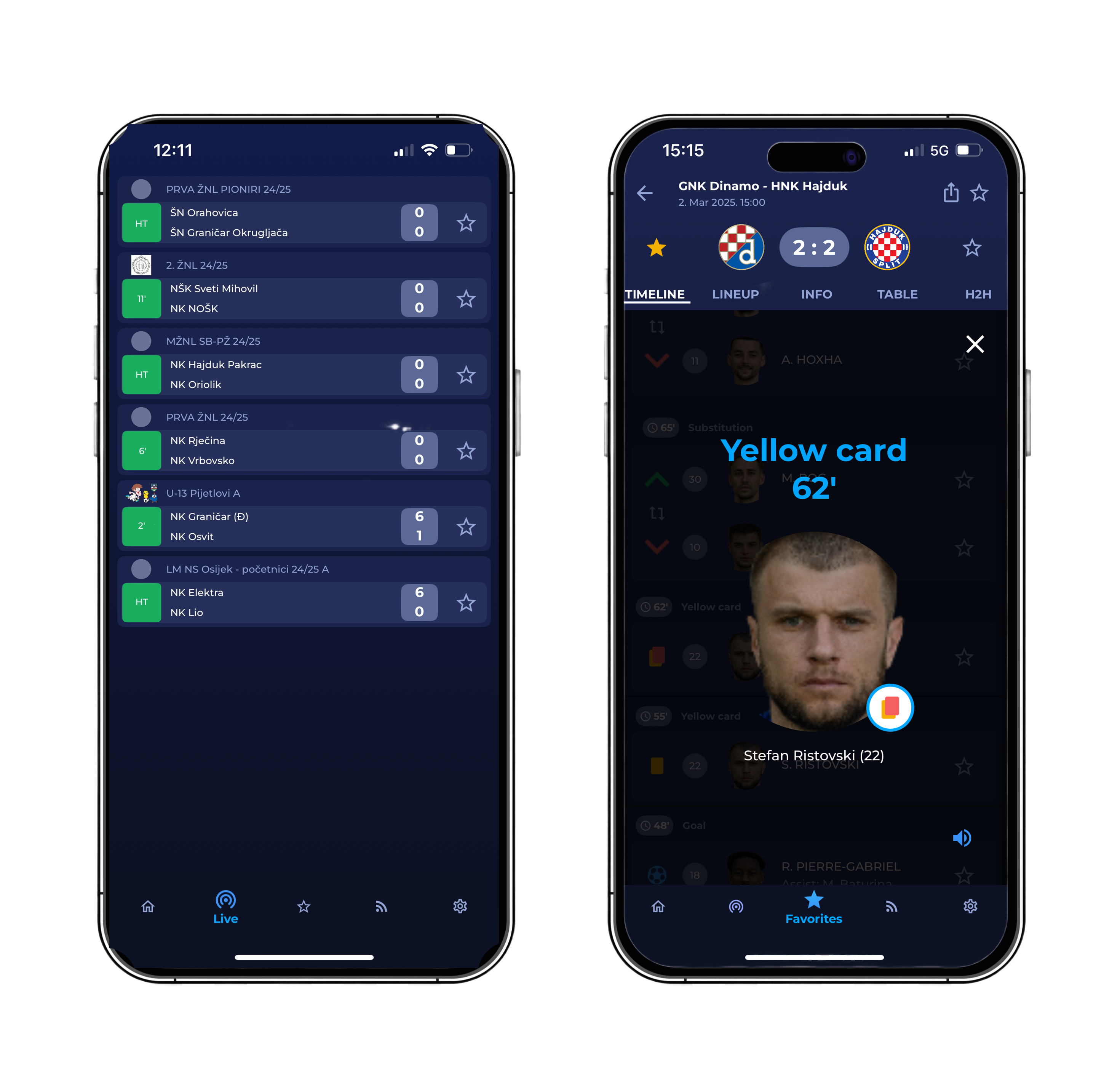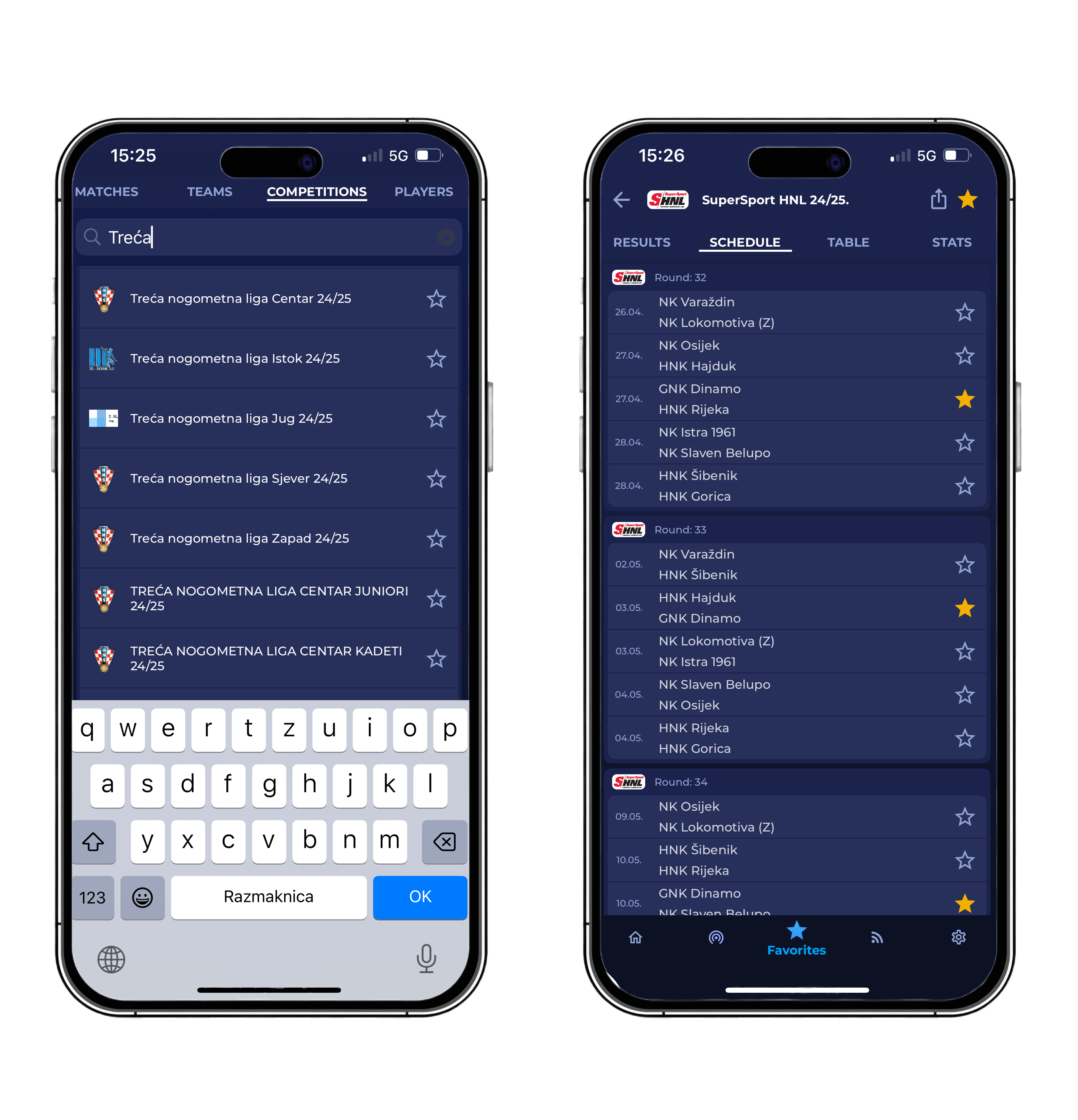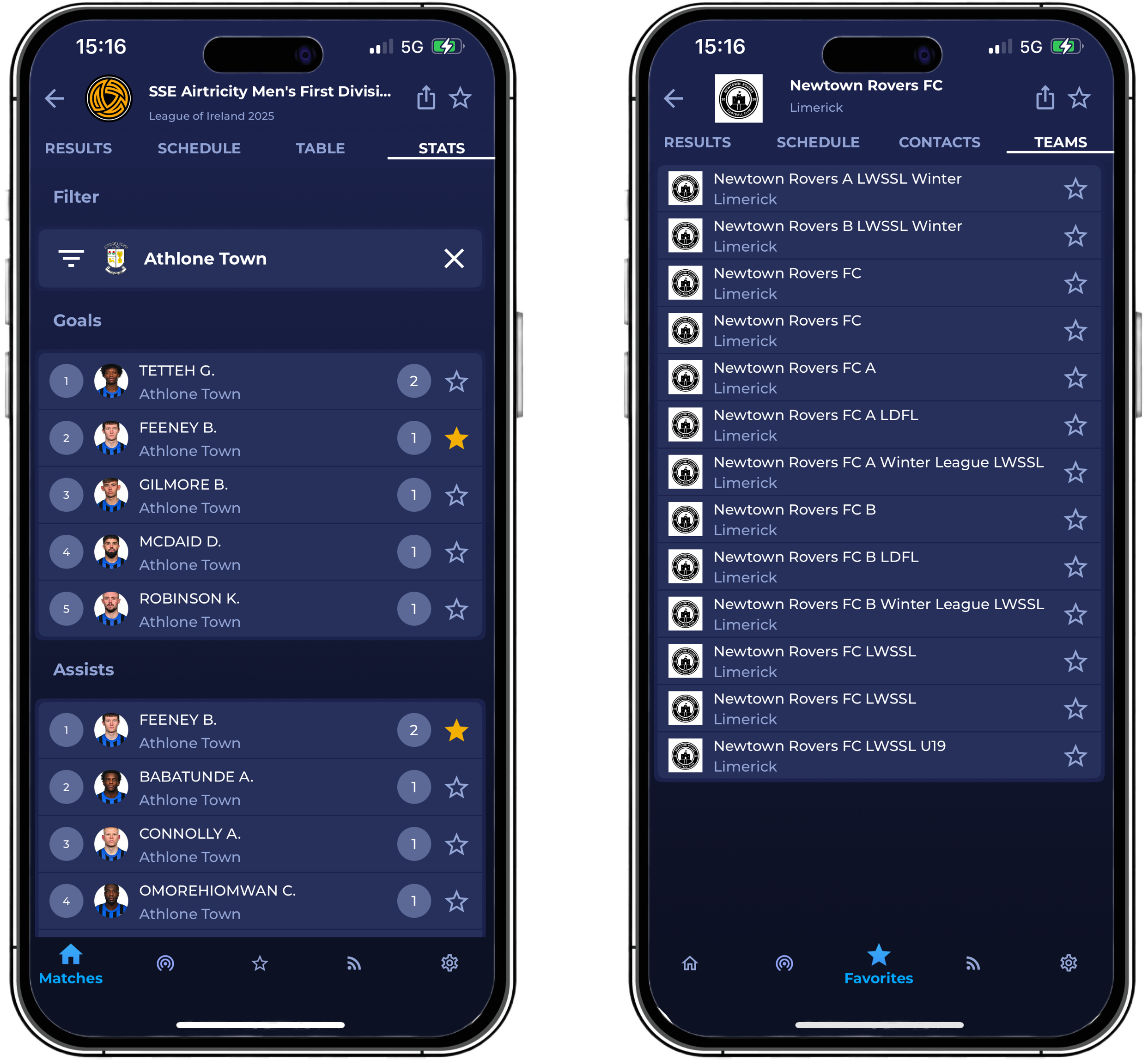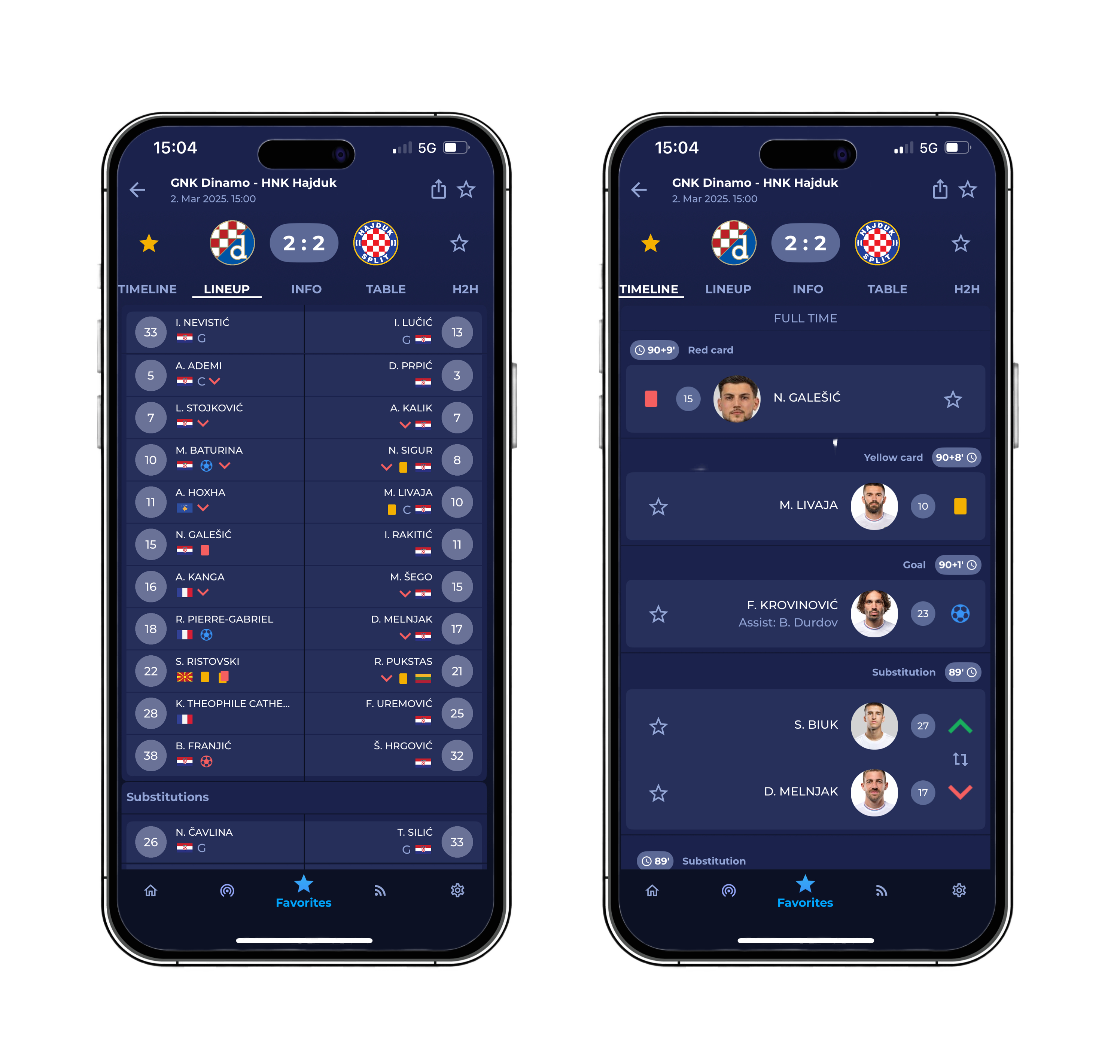 - Add any item (Player, Match, Club/Team, Competition) to favorites for quick access from the Favorites menu