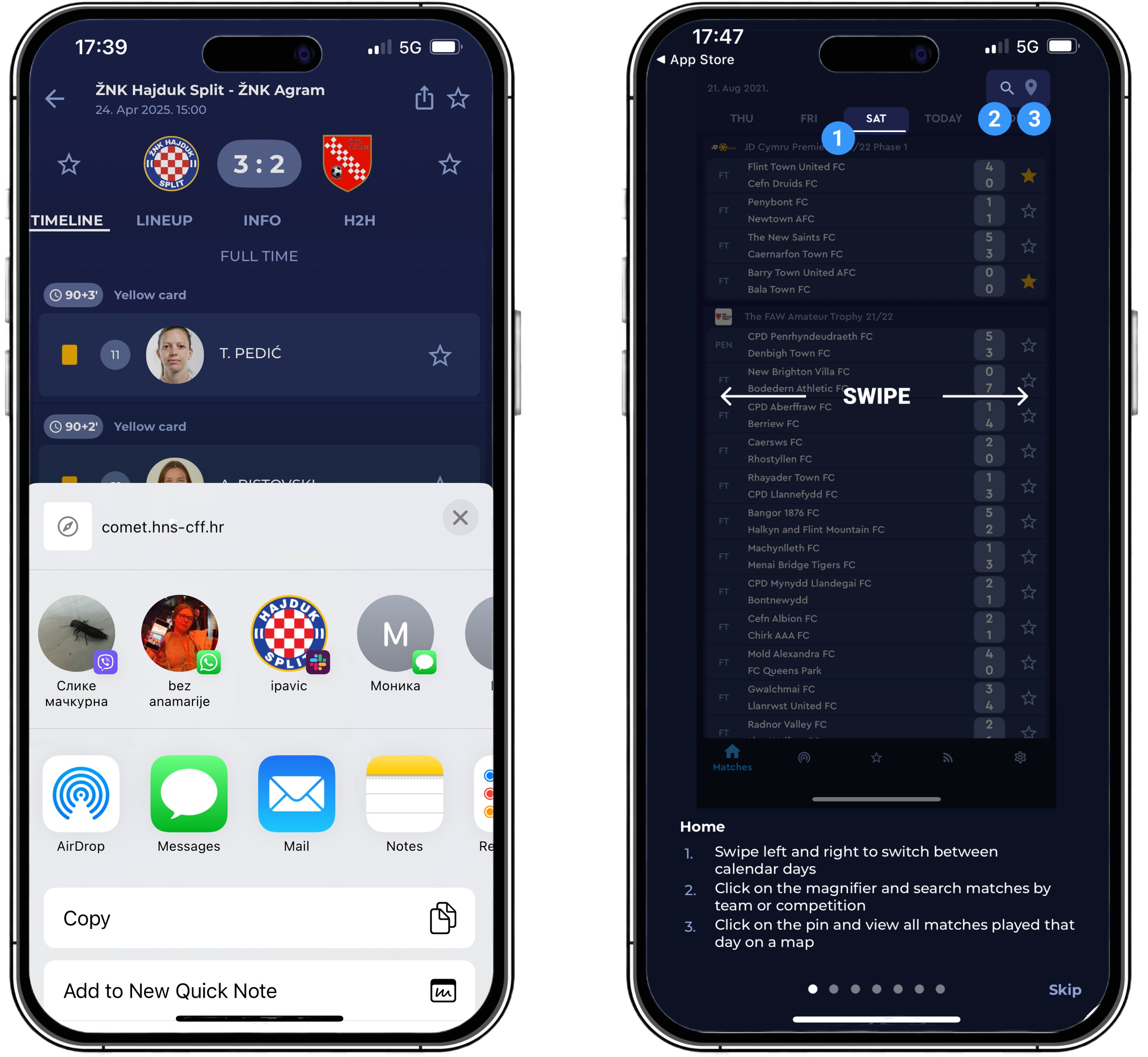 Selecting your favorite Club, Player, Match or Competition via the COMET LIVE app: